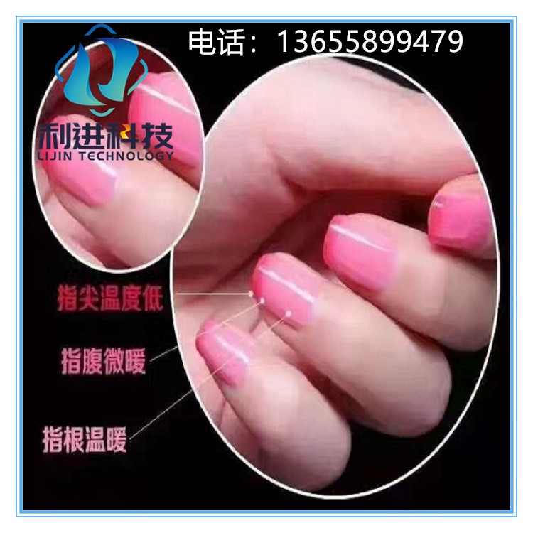 那么,溫變指甲油是怎么做出來的呢?它是由溫變粉為原料加入到指甲油里做出來的,這種指甲油隨著溫度的上升和下降而來回變色的。不僅顏色鮮艷,而且可以實現(xiàn)從“有色一無色”狀態(tài)的顏色變化,這是金屬復(fù)鹽合物型和液品型可逆感溫變色物質(zhì)所不果備的。常規(guī)的感溫變色粉變色溫度為31℃,俗稱手摸變色、手感變色,實際上感溫變色服裝的變色條件只是一個區(qū)間,也就是從開始變色到變色結(jié)束的溫度范圍,這個范圍一般為4~6℃。