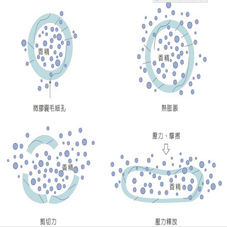 香味微膠囊是利用微膠囊技術(shù),將香精包裹起來,籍由壓力、摩擦、加熱或自然擴(kuò)散等方式,緩慢釋放出香味,香味可持續(xù)半年以上。