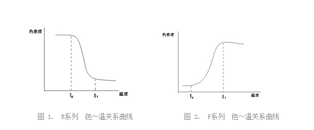 在低溫時(shí)為有色狀態(tài),當(dāng)溫度升至設(shè)定值時(shí)顏料從有色變?yōu)闊o(wú)色。它的變色溫度可根據(jù)用戶需要在-20~70℃范圍內(nèi)設(shè)定:。R系列變色顏料的品種最多,色譜齊全,是最常用的變色顏料系列。其色~溫關(guān)系曲線如圖1所示: